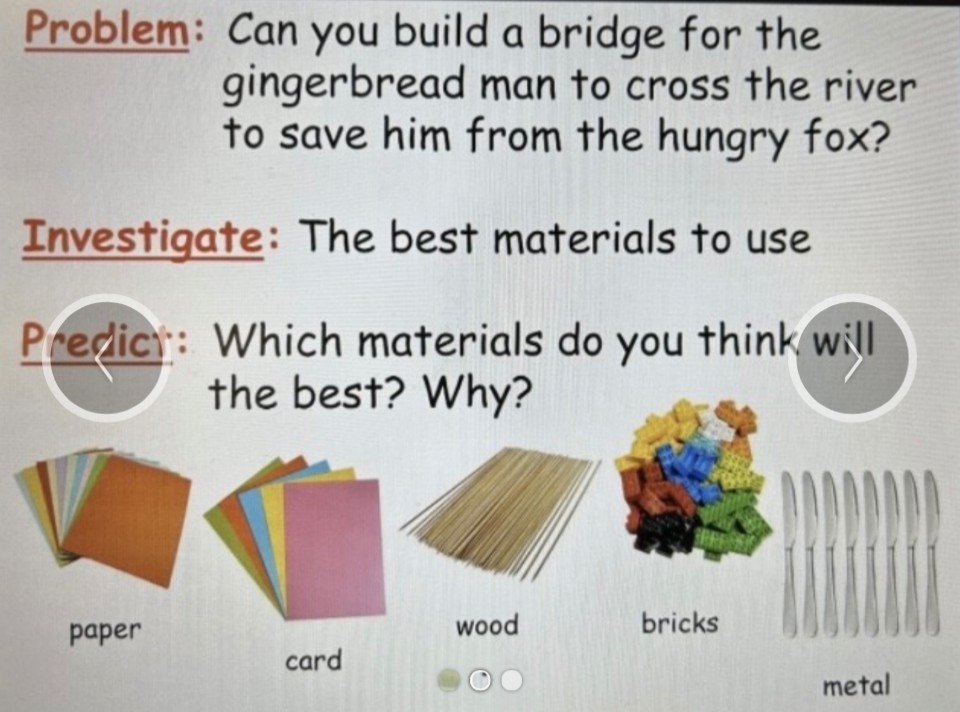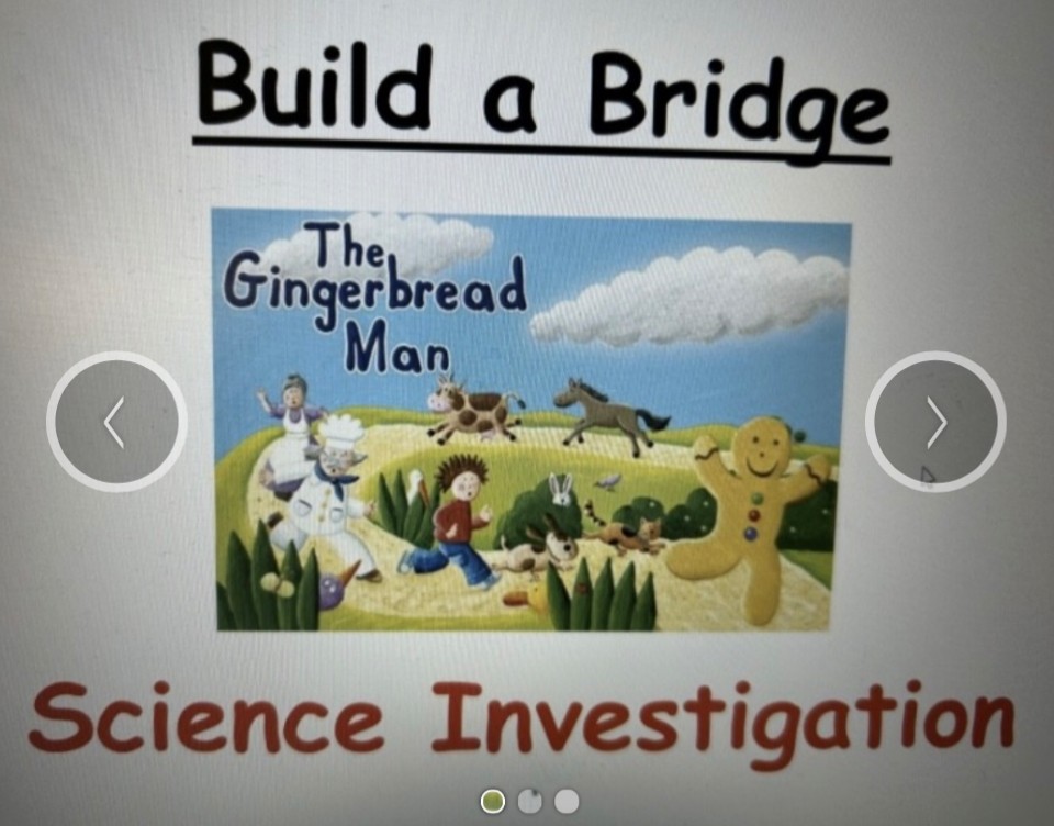 The children in P1JC had to solve a problem for the Gingerbread Man. They had to construct a bridge over the river to stop the fox eating the gingerbread man. We talked about different materials we could use eg paper, card, wood, bricks and metal. The children then predicted whether the materials would be strong enough to hold the Gingerbread man. We looked at real bridges and talked about what they were used for and how strong they needed to be to hold traffic, trains or people. Look what we found out ….